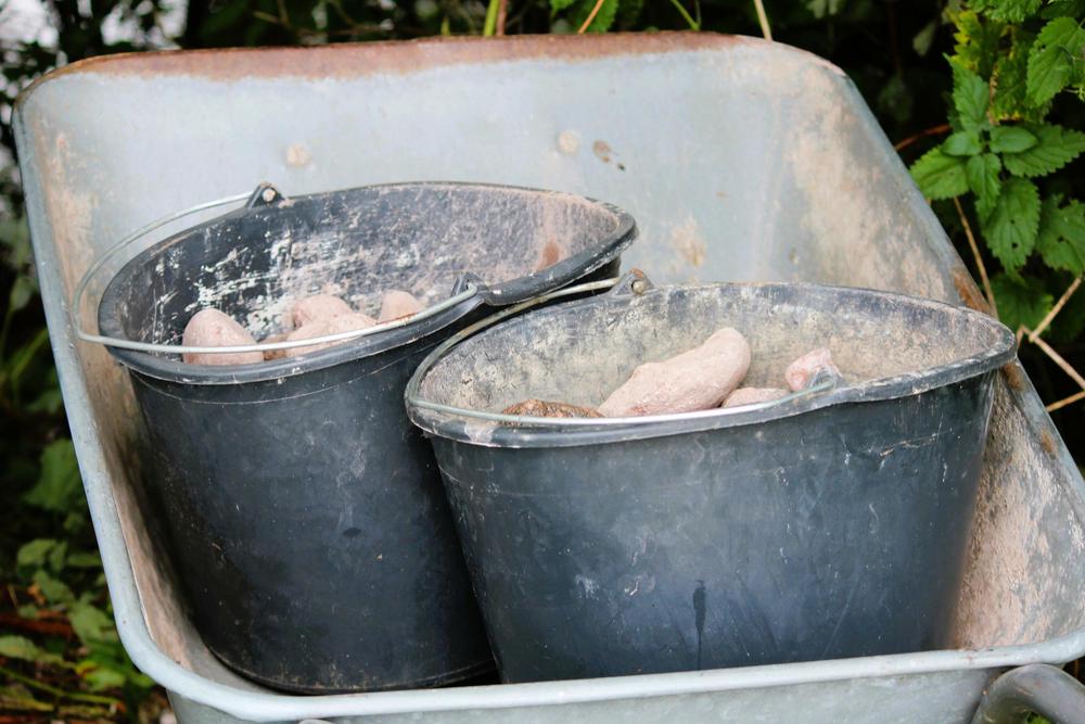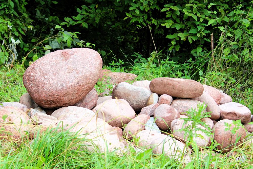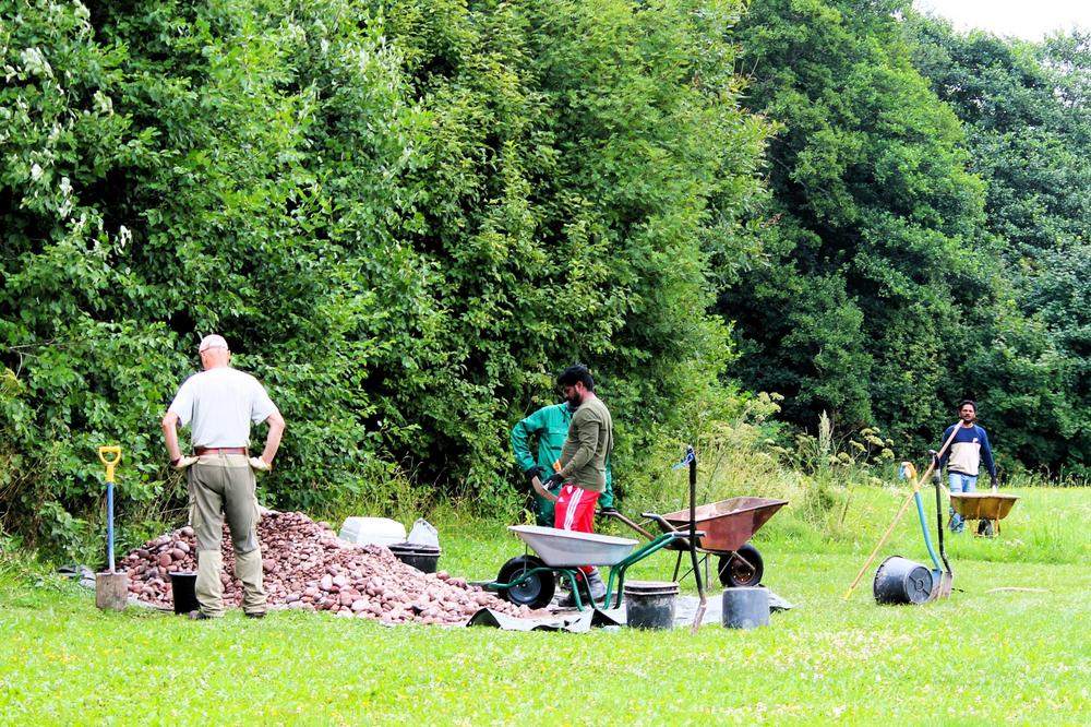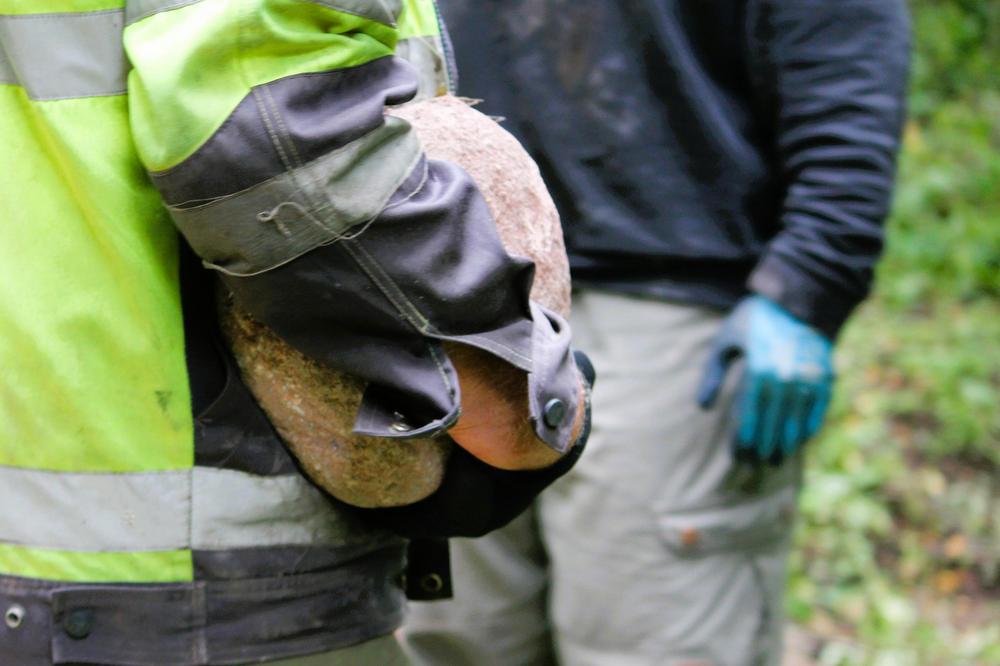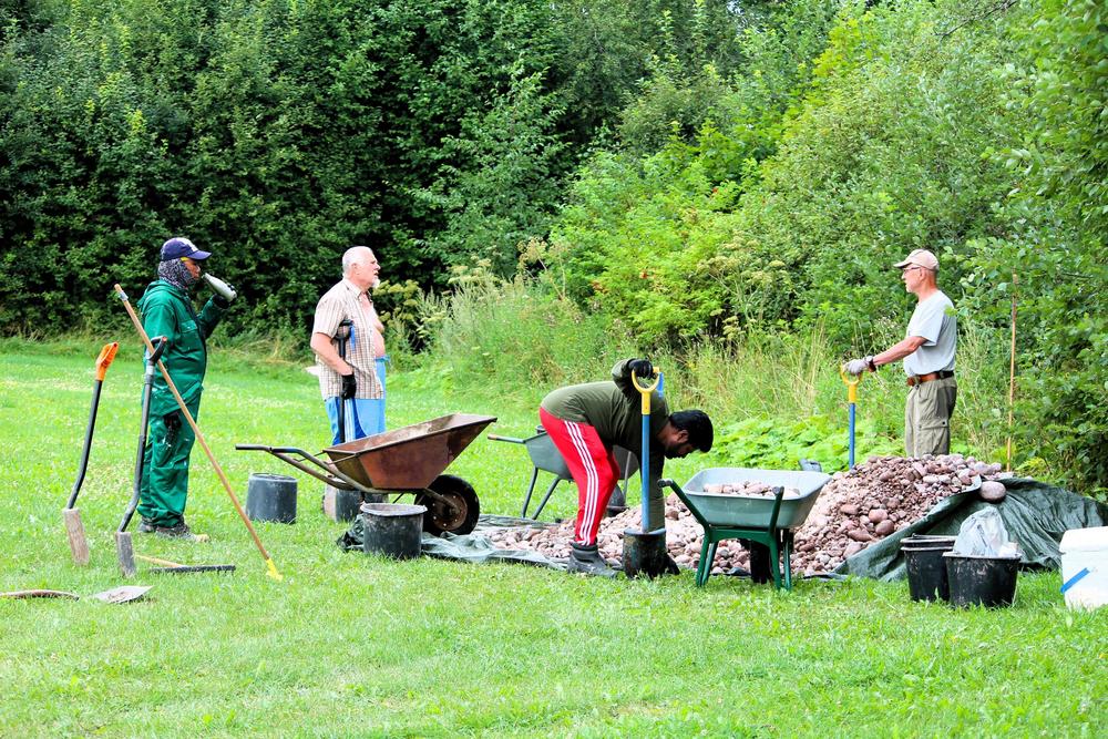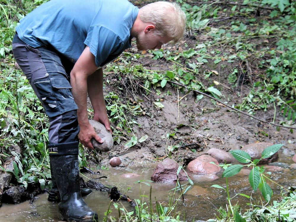 Joen törmälle tuodut pyöreämuotoiset kivet löysivät talkoissa paikkansa.
