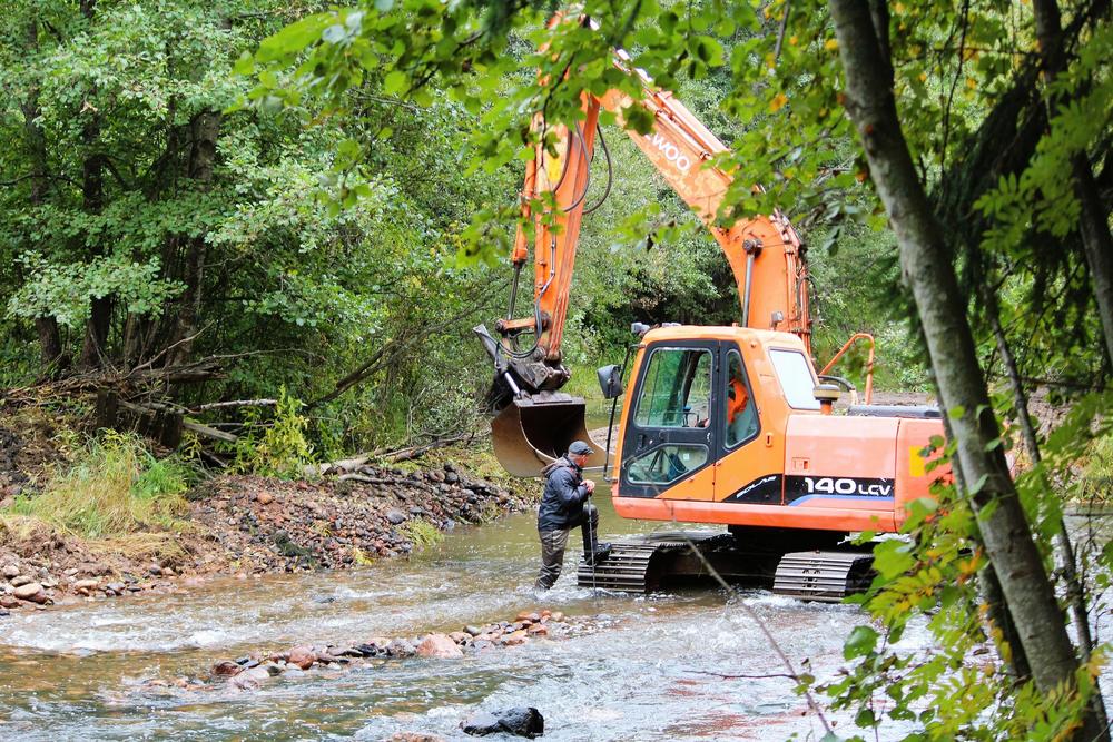 Irjanteella kosken yläpuoli saatiin siistiin kuntoon jo viime viikolla. Maanantaina kosken alapuolelle luotiin uusia uomia uoman keskellä olevan saaren läpi. Vaelluskaloille sopivia kutukiviä ajettiin paikalle kuorma-autolasteittain. Levittämisessä apuna oli kaksi järeää työkonetta.